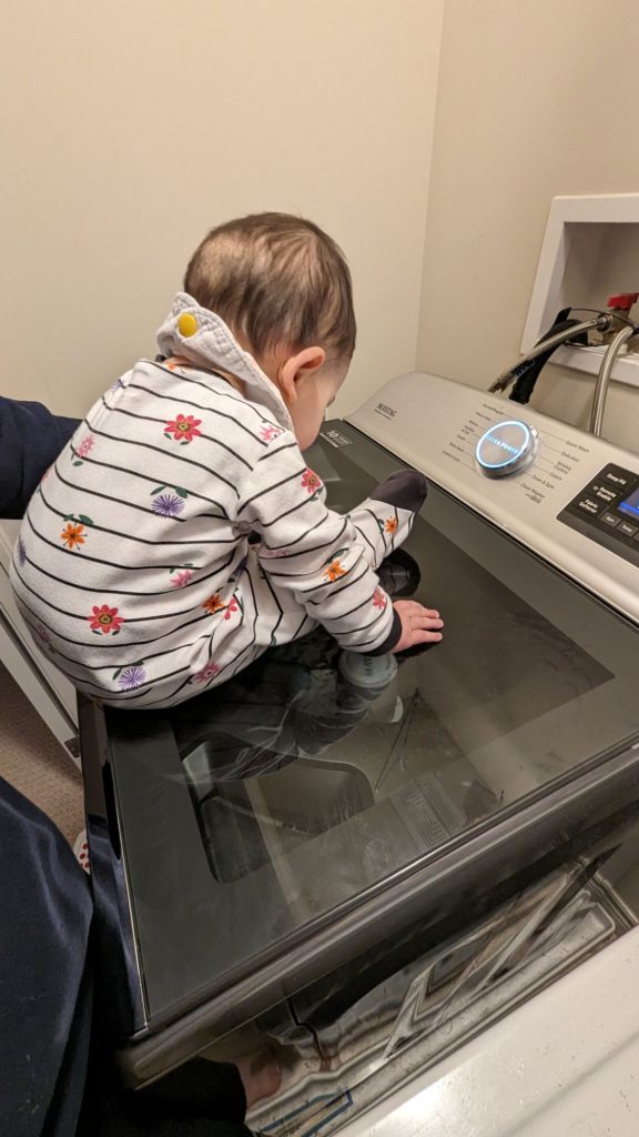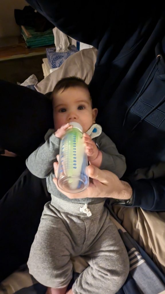 He moved himself into this position! I am just there to support the bottle because it’s glass and a bit heavy when full.